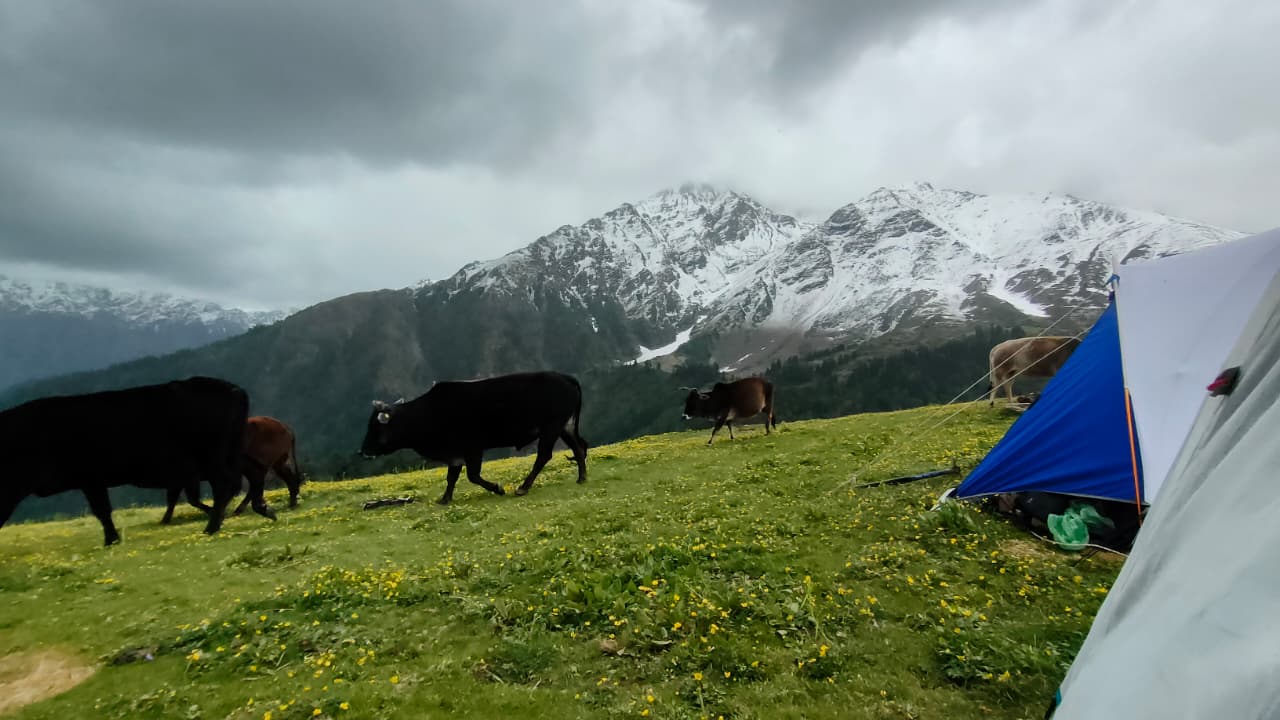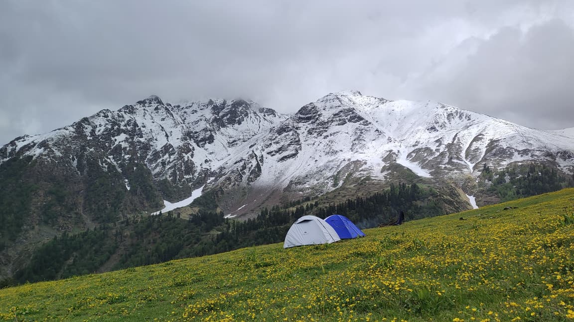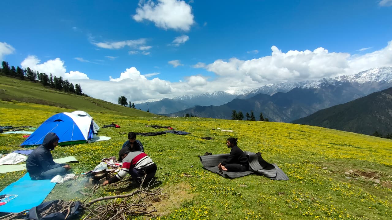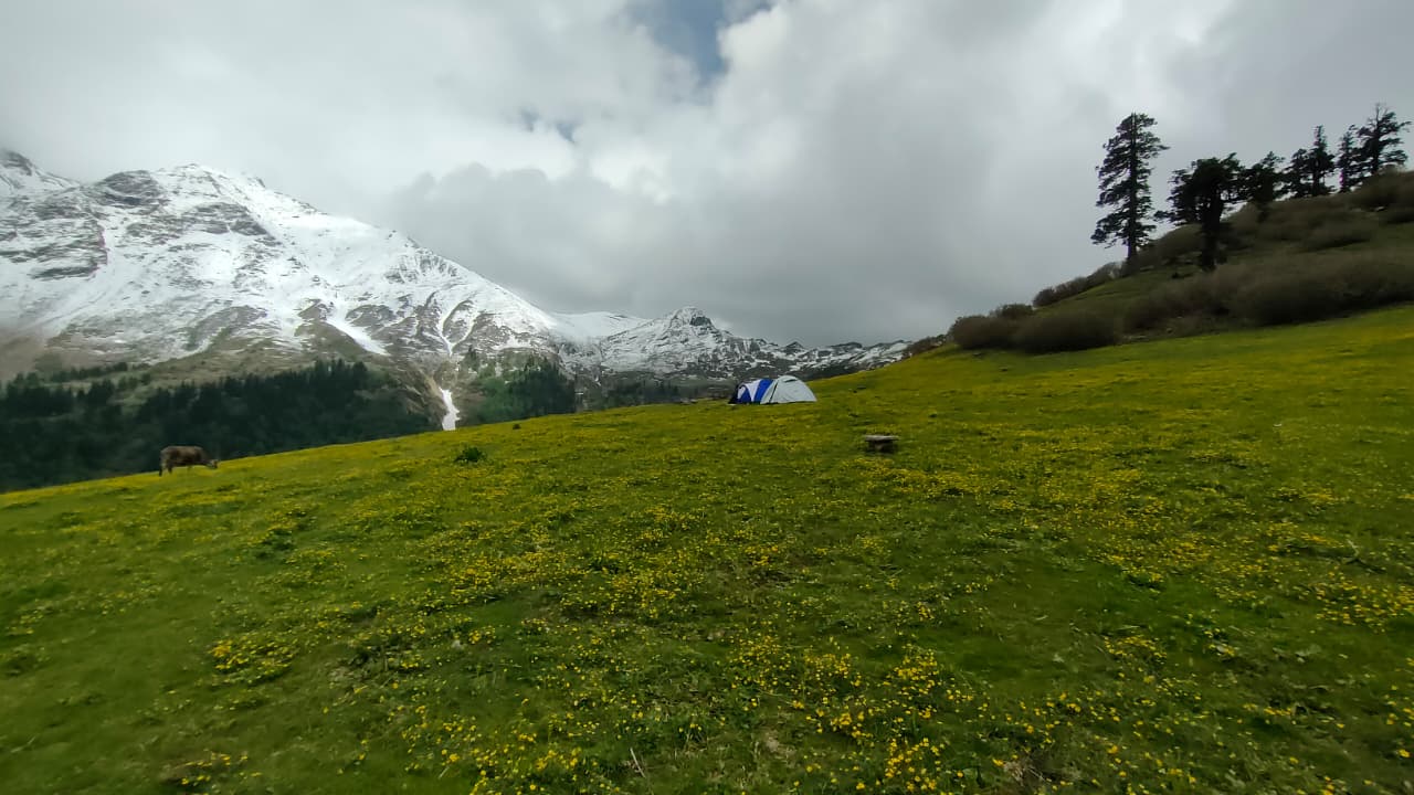The campsite at Pustara Bugyal is one of the major highlights of this trek. Situated at an altitude of about 3,350 meters, it offers stunning sunrise and sunset views. As the golden light falls on the surrounding peaks, the meadow comes alive in vibrant hues, creating the perfect backdrop for trekkers, photographers, and nature lovers.